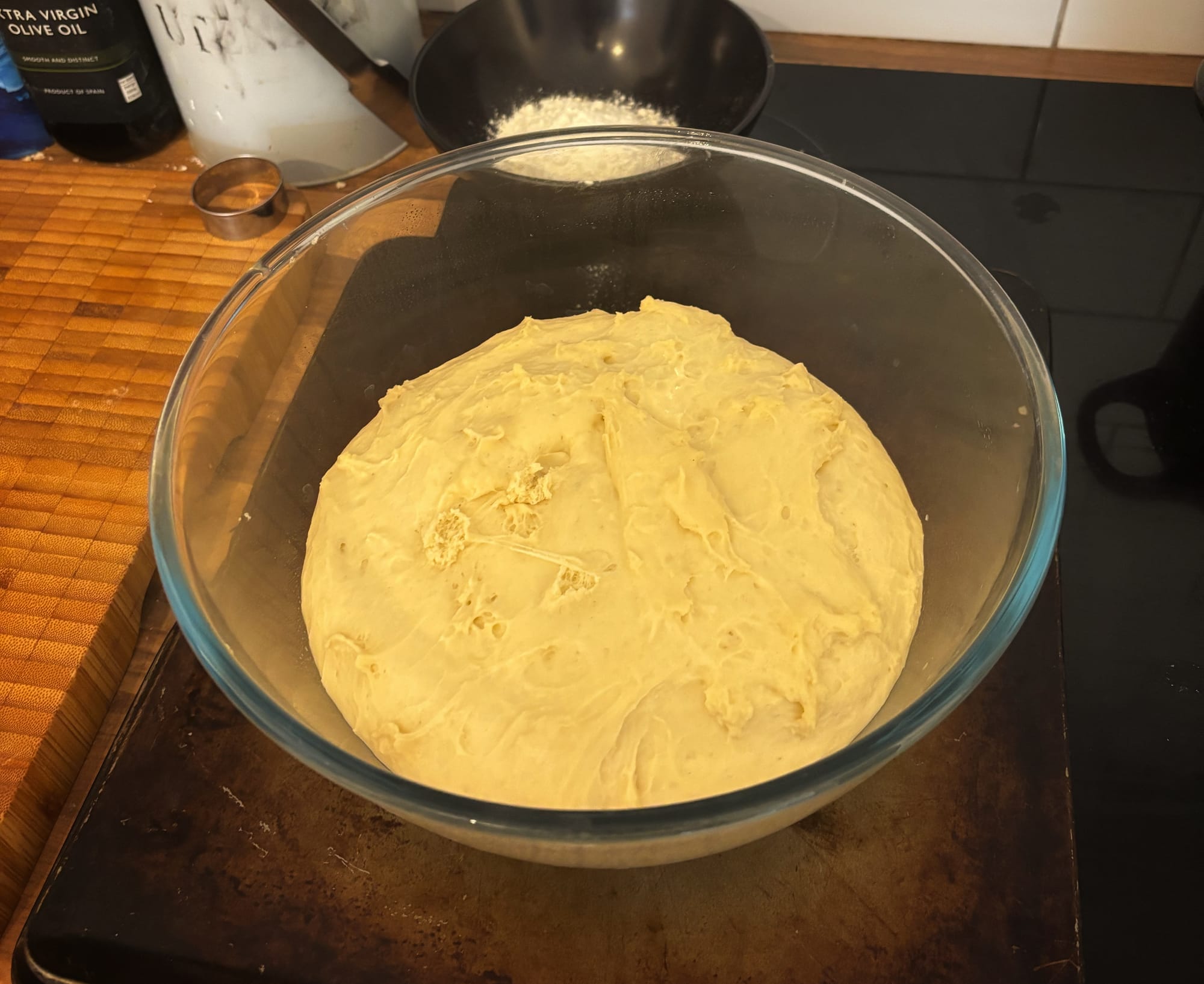 Not knowing how to do something has never gotten in my way for long. I know I’m making an enriched dough, so I warm up some milk and whisk in some yeast, and a decent bit of honey to get the yeast waking up. According to the show, I’m meant to be using bread flour and self-raising flour. I do not have the latter, so I chuck in some baking powder. Probably not enough. In theory, I know the right ratios to turn plain flour into self-raising flour. In practice, those ratios like to whisk themselves out of my brain at inopportune moments.