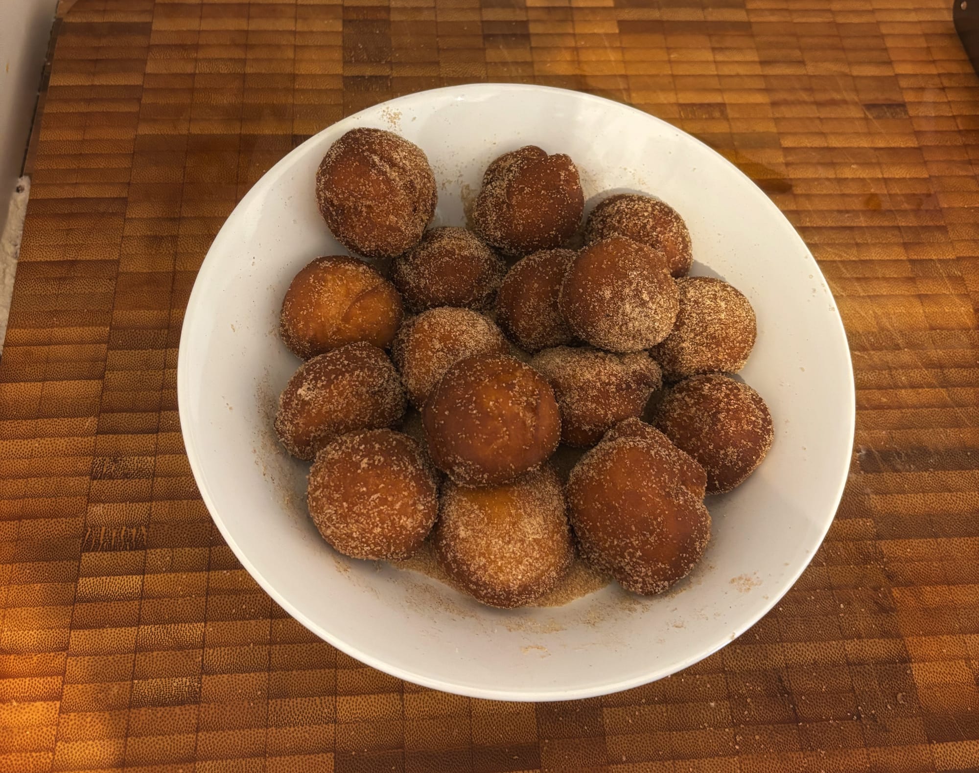 After half an hour, my doughnuts look slightly puffier. Because I am a genius, I’ve saved my doughnut holes (insert dirty joke here) and use one to test the oil. It’s hot, the hole cooks. A delight. I start frying doughnuts, two at a time, and only manage to burn myself once. A win, all around. It takes about fifteen minutes to cook the lot, and now there’s nothing to do but wait for the bastards to cool down. Except there is. I fry the donut holes, and immediately chuck them in cinnamon-sugar. They taste like those terrible little doughnuts bought at a fair. It is the best thing I have ever done. They’re sexier than that time I dressed up as Jareth the Goblin King for Halloween (which required many, many pairs of socks.) If nothing else goes right this week, at least I have had this.